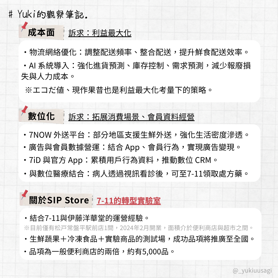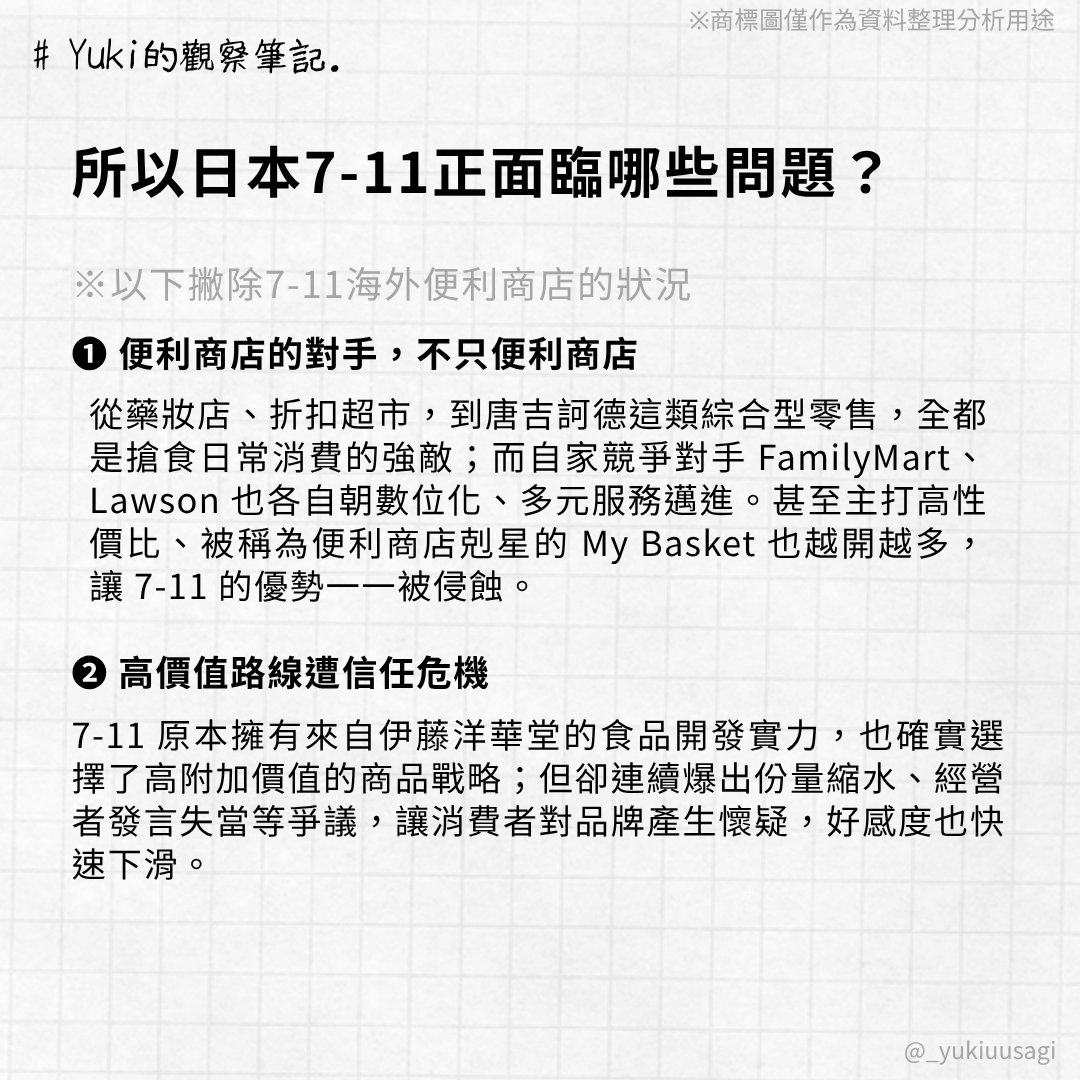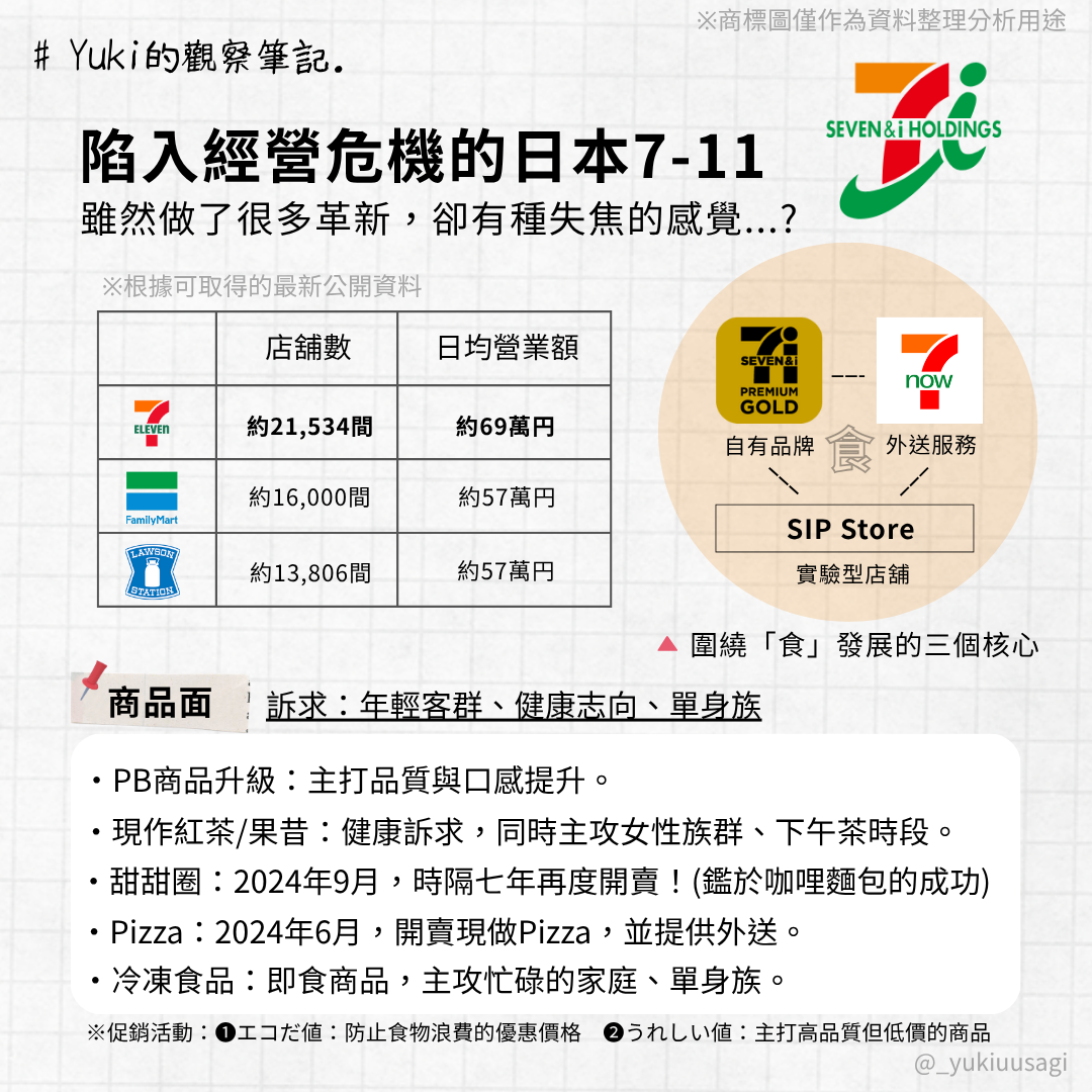 隨著 7&i 集團加速重組、便利商店事業日益成為核心,7-11 本體也迎來轉型關鍵期。但在這過程中,我觀察到兩個特別值得關注的挑戰: