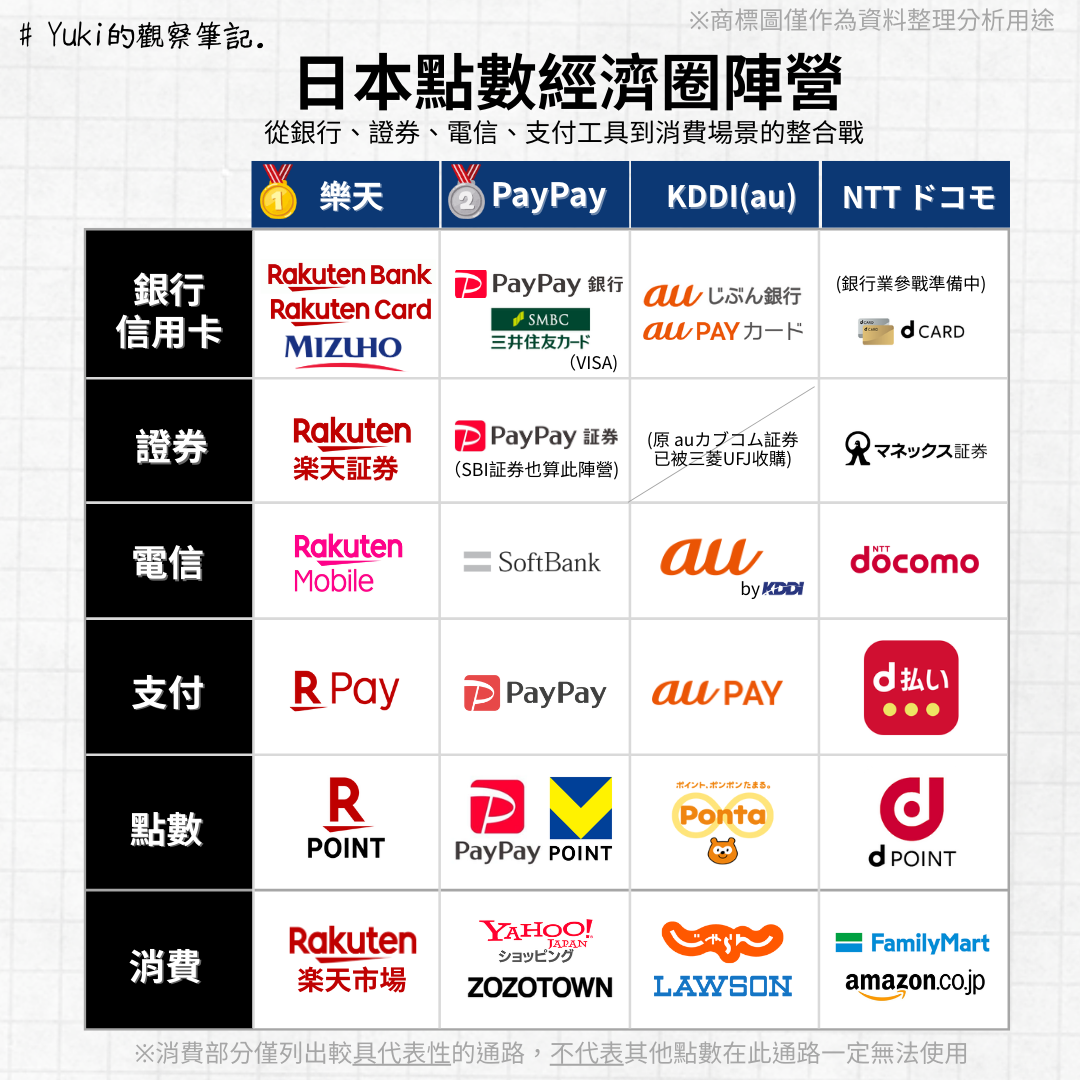 但也藉此機會,我試著簡單來梳理目前日本「以支付與電信為主軸」的點數經濟圈架構,希望能幫助大家理解這場戰爭到底在比什麼。